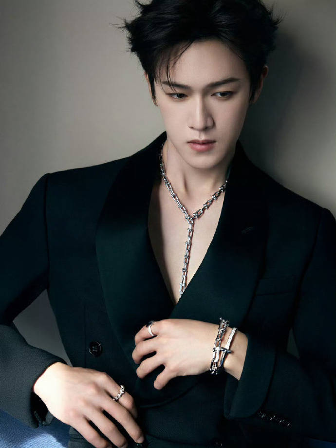 都说男星戴珠宝容易像“暴发户炫富”,但李昀锐这次把Tiffany的珠宝戴成了造型的“灵魂锚点”。HardWear系列的粗链条项链顺着深V领口垂下来,金属光泽在黑色西装上像流动的光,既打破了全黑的单调,又没抢过西装本身的极简感;手腕上叠戴的T系列手镯和戒指,在抬手打招呼时若隐若现,细节处的精致感比满身logo高级多了。这种“少即是多”的搭配逻辑,简直是给内娱男星上了一堂时尚课——珠宝是加分项,不是炫富工具。